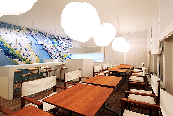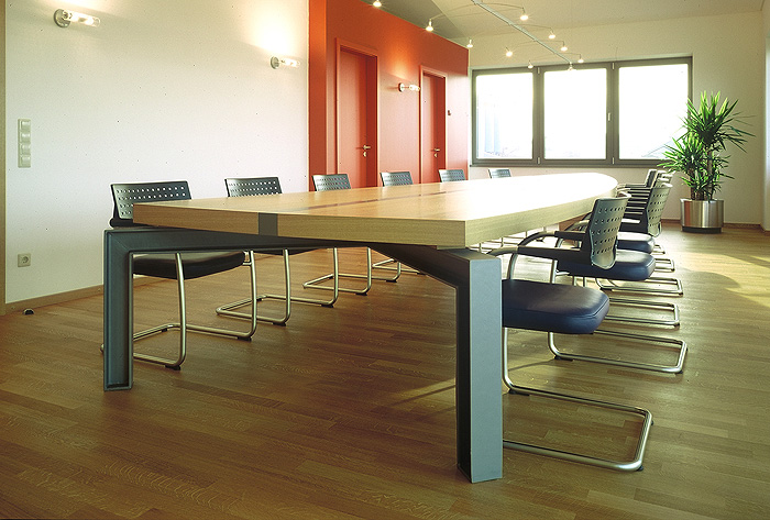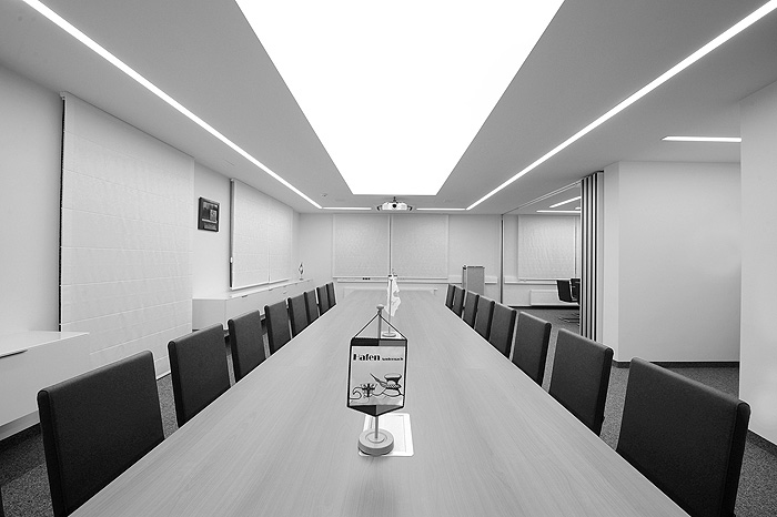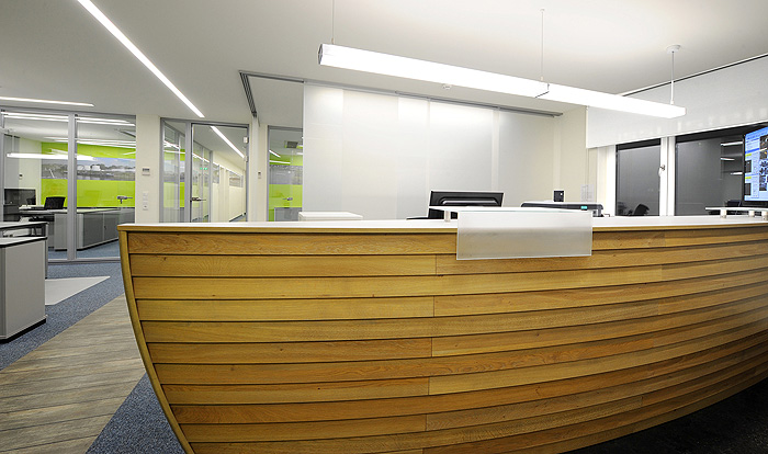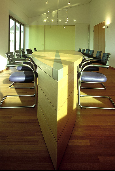 So kann man sagen, dass das Gesamtprojekt aus einem Guss entstanden ist, ein Idealfall! Von Empfang, Wartezone, Produktpräsentation, mit Integrieren des hauseigenen Rohstoffes Bims als Gestaltungsmittel und Akustikmaßnahme, über Kaffeetheke, Konferenzraum mit Eigenentwurf des Konferenztisches und Multimediaeinbauwand, bis zum Chefbüro, zieht sich eine zeitlos, klassisch Linie durch, das Gebäude, lichtdurchflutete, freundliche Räume, mit der Verkörperung von Bodenständigkeit und Langlebigkeit, passend zum Produkt und Bauherrenwunsch.